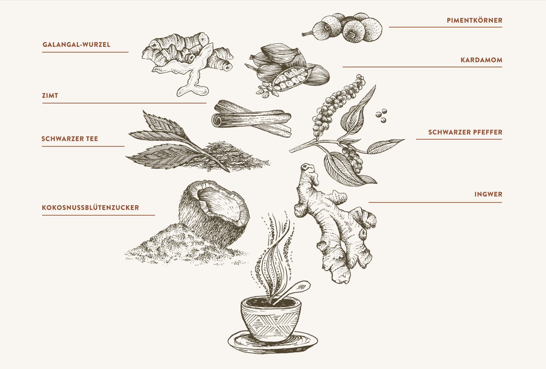 Während Pfeffer ursprünglich zu Südindien gehört, wird er auch in anderen tropischen Ländern angebaut. Er hat in der Geschichte eine wichtige Rolle gespielt und gilt seit jeher als ein wichtiges Gewürz. Im antiken Griechenland wurde er auch als Währung verwendet. Um schwarzen Pfeffer herzustellen, müssen die Pfefferkörner kurz vor der Reife gepflückt, fermentiert und dann getrocknet werden, bis sie schrumpfen und schwarz werden. Für Molina Chai verwenden wir den schwarzen Malabar-Pfeffer aus Indien mit seinem mild-dunklen, leicht bitteren Geschmack.